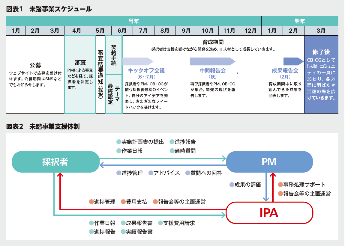 対象や目的によって「未踏IT人材発掘・育成事業」「未踏アドバンスト事業」「未踏ターゲット事業」のラインナップがあります。いずれも毎年11月頃から翌年春にかけて公募が行われ、IT社会をリードするプロジェクトマネージャー(PM)による審査などを経て採択者を決定。7月から翌年2月までの育成期間中、採択者はさまざまな支援を受けながらプロジェクトを進めていきます(図表1・2)。