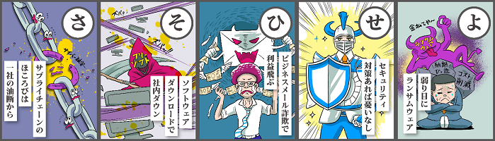 本かるたは、ランサムウェアやフィッシング詐欺といった昨今多く報道されているリスクに加えて、パスワードの使い回しやWi-Fiからの情報漏洩など、身近な業務に潜むリスクを取り上げることで、中小企業が自らのセキュリティ対策を考えるきっかけとして利用・シェアできるよう画像ファイルにより提供しています。それぞれ100文字程度の解説も加えており、対策のヒントとして役立てるほか、SNSでシェアすることにより身近な人と気付きを共有することも可能です。