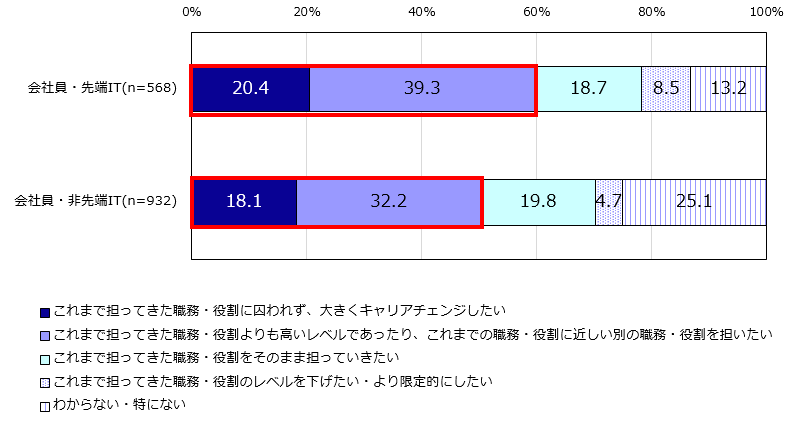 (1) 先端IT・非先端ITの会社員いずれも半数以上がこれまでよりも大きなキャリアチェンジや高いレベルの職務・役割を志向している。
