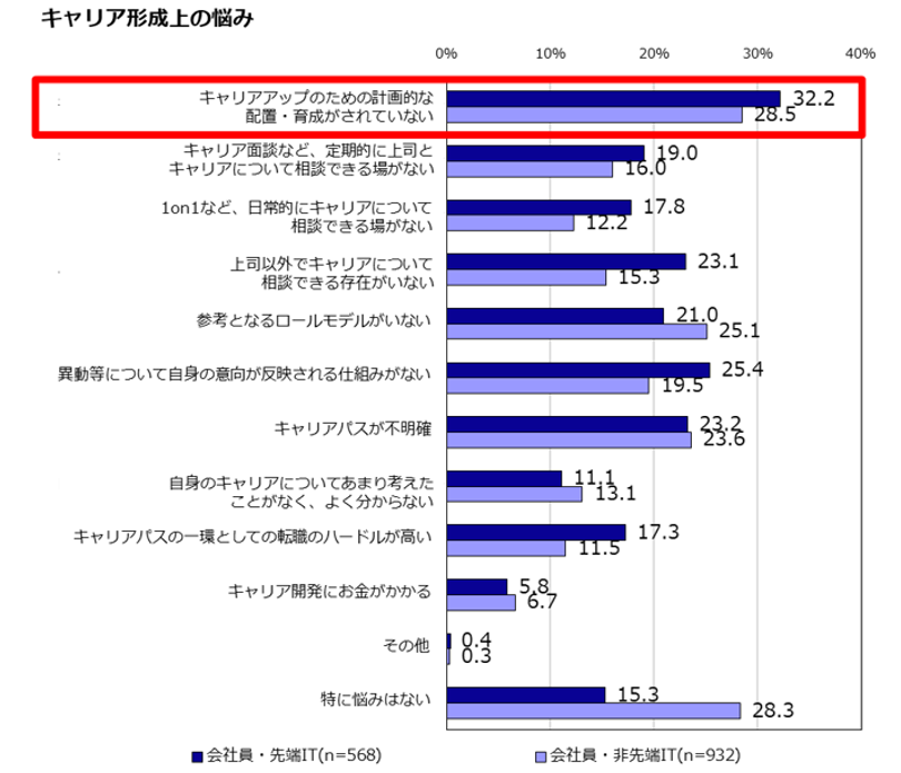今回のアンケート調査において、企業に所属するIT人材1500人を先端IT従事者と、非先端IT従事者(注釈2)に分類して分析したところ、いずれも半数以上がキャリアアップに前向きなことが分かりました。その半面、所属企業においてキャリアアップのための計画的な配置・育成がされていないことが課題として浮き彫りになりました。さらに企業調査では、IT人材のスキルを適切に評価できていない現状も明らかになりました。本調査の主なポイントは以下の通りです。