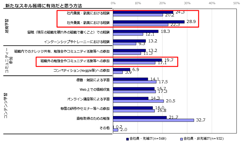 キャリア形成上の悩みに関する質問では、先端IT従事者の32.2%、非先端IT従事者の28.5%が所属企業に対して「キャリアアップのための計画的な配置・育成がされていない」と回答し、最も多い割合となりました。(図2)また、新たなスキル獲得に有効な方法としては、先端ITの会社員の28.9%が「社外兼業・副業における経験」を挙げたほか、同19.7%が「組織外の勉強会やコミュニティ活動等への参加」を挙げています。(図3)従来からのコンテンツ学習に加えて、キャリアアップの場として越境学習や社外のコミュニティの活用が指向されてきていると考えられます。