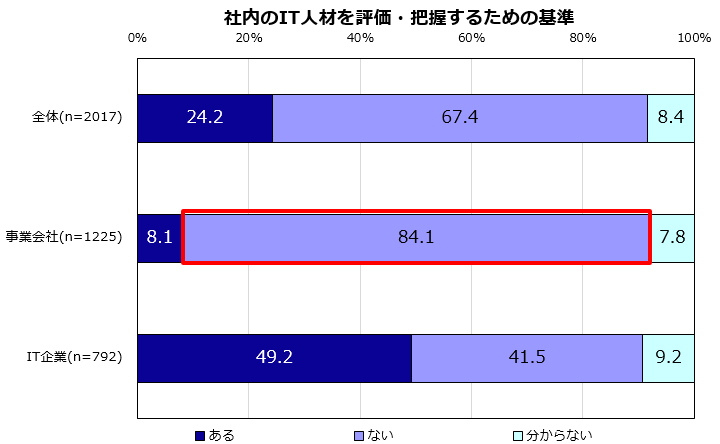 事業会社では、社内のIT人材を評価・把握する基準についても「ない」と回答した企業が80%を超えており、IT人材のスキルを評価する基準を整備して適切に評価することが求められます。(図4)