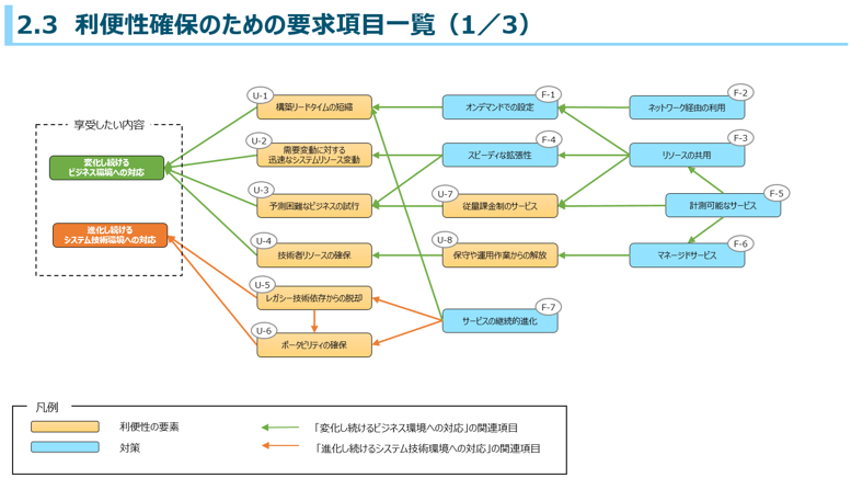 次に、1で整理した「享受したい内容」をもとに、自律性の観点では「問題・リスク」を、利便性の観点では「利便性の要素」を、樹形図を使って明確にしていきます。自律性では、サービスの構成要素を5つ(データ、運用、ソフトウェア、ハードウェア、データセンター・通信)に大別し、それぞれ問題・リスクを洗い出したうえで対策を示しています。利便性では、ビジネス環境や技術環境の変化に対応するための要素を7つ示し、その対策を紐づけています。樹形図を俯瞰することで、どの問題・リスクに対策を講じるべきか、どの利便性の要素をどの対策で得るべきかを検討しやすくなります。(図1)