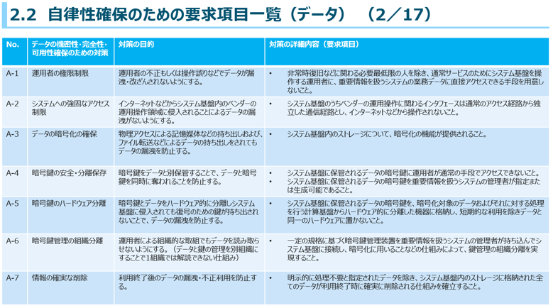 最後に、明確化した「問題・リスク」や、「利便性の要素」に紐づく「対策」を樹形図から選定し、「対策」ごとの目的と詳細内容(要求項目)を確認します。本ガイドでは、対策、目的、詳細内容(要求項目)を表で一覧として示すことで、管理者が目的を理解しながら要求項目を選定できるようにしています。例えば、「暗号鍵の安全・分離保存」という対策には、「暗号鍵をデータと別保管することで、データと暗号鍵を同時に奪われることを防止する」との目的が示され、「データの暗号鍵に運用者が通常の手段でアクセスできないこと」等の要求項目が明示されています。(図2)