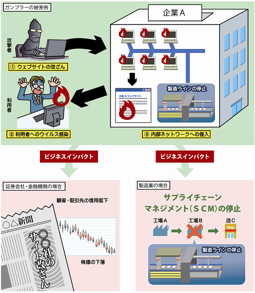 2009年には、「ガンブラー(Gumblar)」と呼ばれる手口(攻撃手法)をはじめとした、様々な情報ネットワーク関連の事件が発生しました。特に「ガンブラー」事件(図1)では、ウェブサイトの運営委託先からウェブサイトのユーザIDやパスワードが盗まれた事例もあり、自組織だけではなく業務委託先も含めた総合的なセキュリティ対策の必要性が浮き彫りになりました。このような取組が従来から必要であった事実を認識し、自組織のセキュリティ対策を進める必要があります。