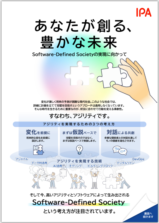 IPAでは、Software-Defined Society(SDS)の実現に向けて、普及啓発活動、国内外の動向調査、ならびにオープンソースやモデリング、AIといったソフトウェアを効率的かつ高品質に整備するための手法の確立と普及に取り組んでいます。