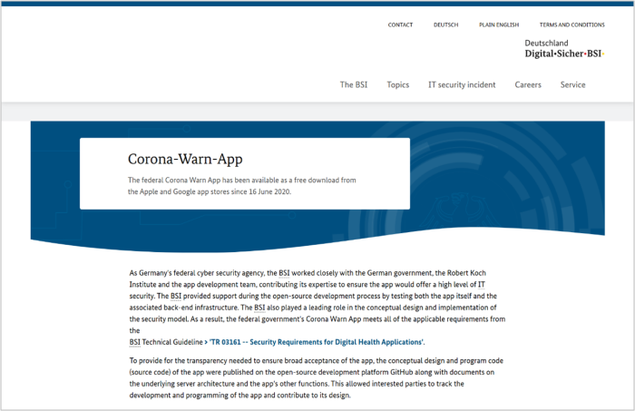 The Corona-Warn-App is a contact tracing app developed as a measure against the novel coronavirus. Its design, which balances privacy protection and transparency, has received high international acclaim. The implementation of Bluetooth-based contact detection technology and decentralized data management has influenced the development of public health apps in other countries. Commissioned by the German Federal Government, it was jointly developed by government agencies such as the Robert Koch Institute (RKI) and the Federal Office for Information Security (BSI), along with private companies including SAP and Deutsche Telekom.