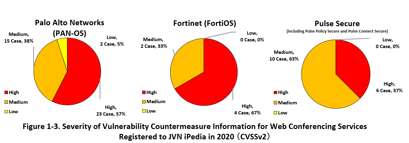 Figure 1-3 shows the percentage of severity of vulnerability countermeasure information registered to JVN iPedia in 2020 for the VPN products listed in the alerts. From left to right: Palo Alto Networks' VPN (PAN-OS), Fortinet's VPN (FortiOS), and Pulse Secure's VPN (including Pulse Policy Secure and Pulse Connect Secure).