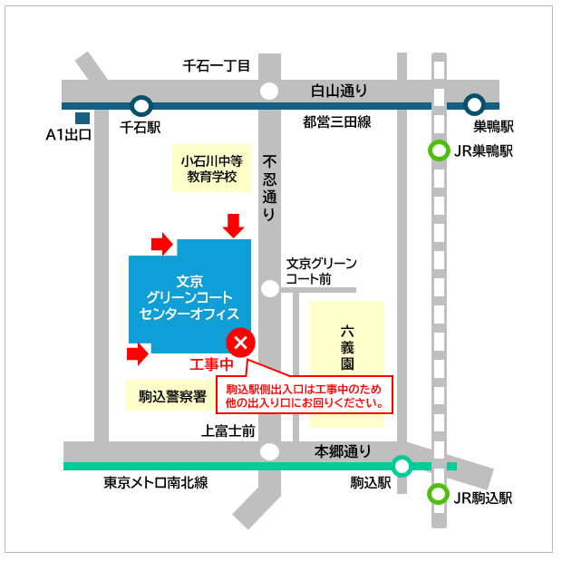 駒込駅側出入口は工事中のため、他の出入り口にお回りください。