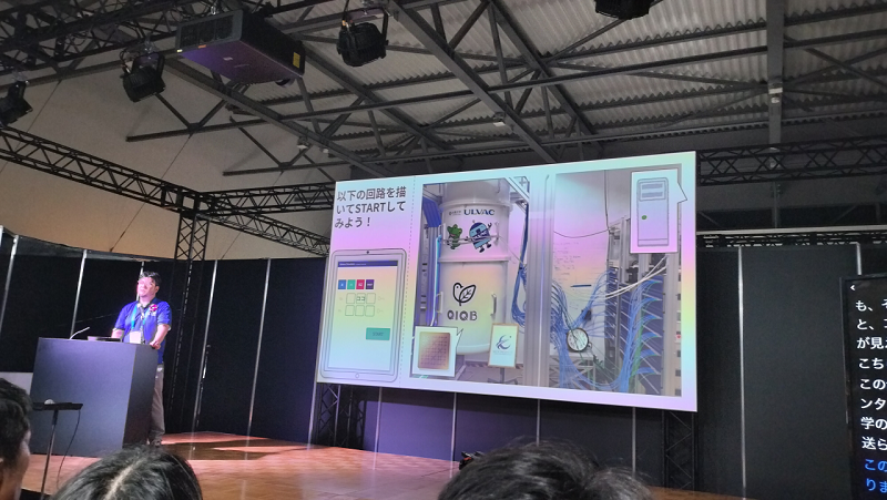 テーマウィークは、大阪・関西万博のテーマ「いのち輝く未来社会」を創造することを目指し、8つのテーマを立ててステージや展示などを実施するプログラム。テーマ「未来のコミュニティとモビリティ ウィーク」の「量⼦・海・宇宙」の世界をアートとサイエンスで体感する展覧会に、大阪大学量子情報・量子生命研究センター(QIQB)が参加。束野さんたちが開発する量子コンピュータを来場者が操作できる展示や、ステージイベントを実施。