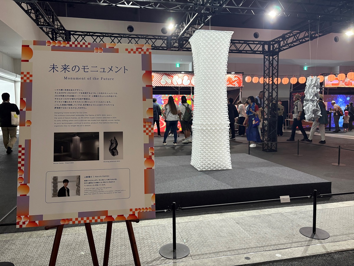 IPAが描く将来像を体現したパビリオン「Live Anywhere」では、ゴーグル型デバイスを着用して体感する没入型インスタレーションと、屋台をテーマとした展示や体験コンテンツを実施。会場内には上條さんの制作による伸縮する布製のモニュメントを設置。