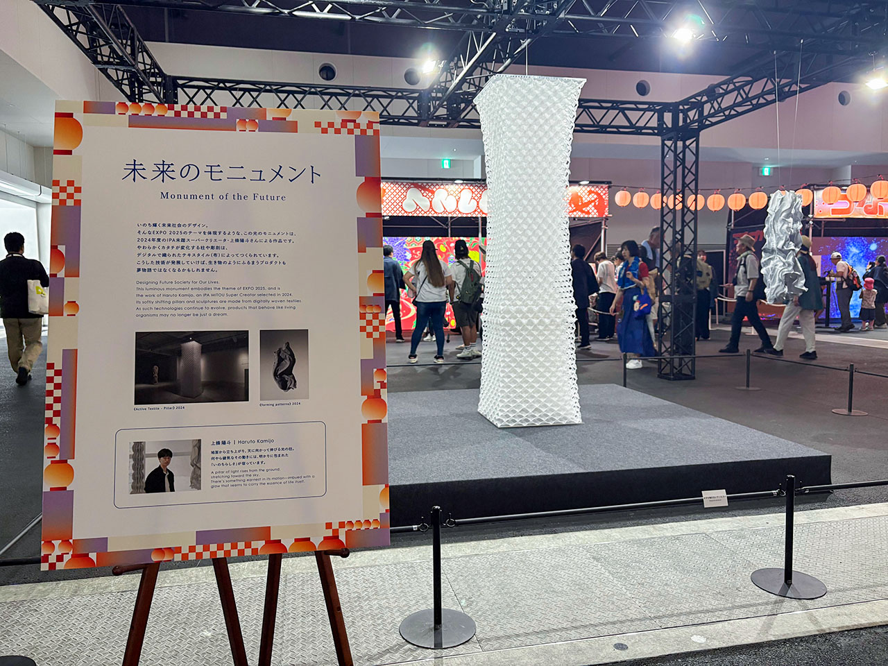 上條はい、伸縮する布製のモニュメントを設置しました。万博には大学やデザイン分野の先輩が携わっていて、自分も関われたらいいなと思っていたので、自分の作品を展示することになって本当にうれしかったです。そして展示が終わった直後に閉会式の話もいただきました。