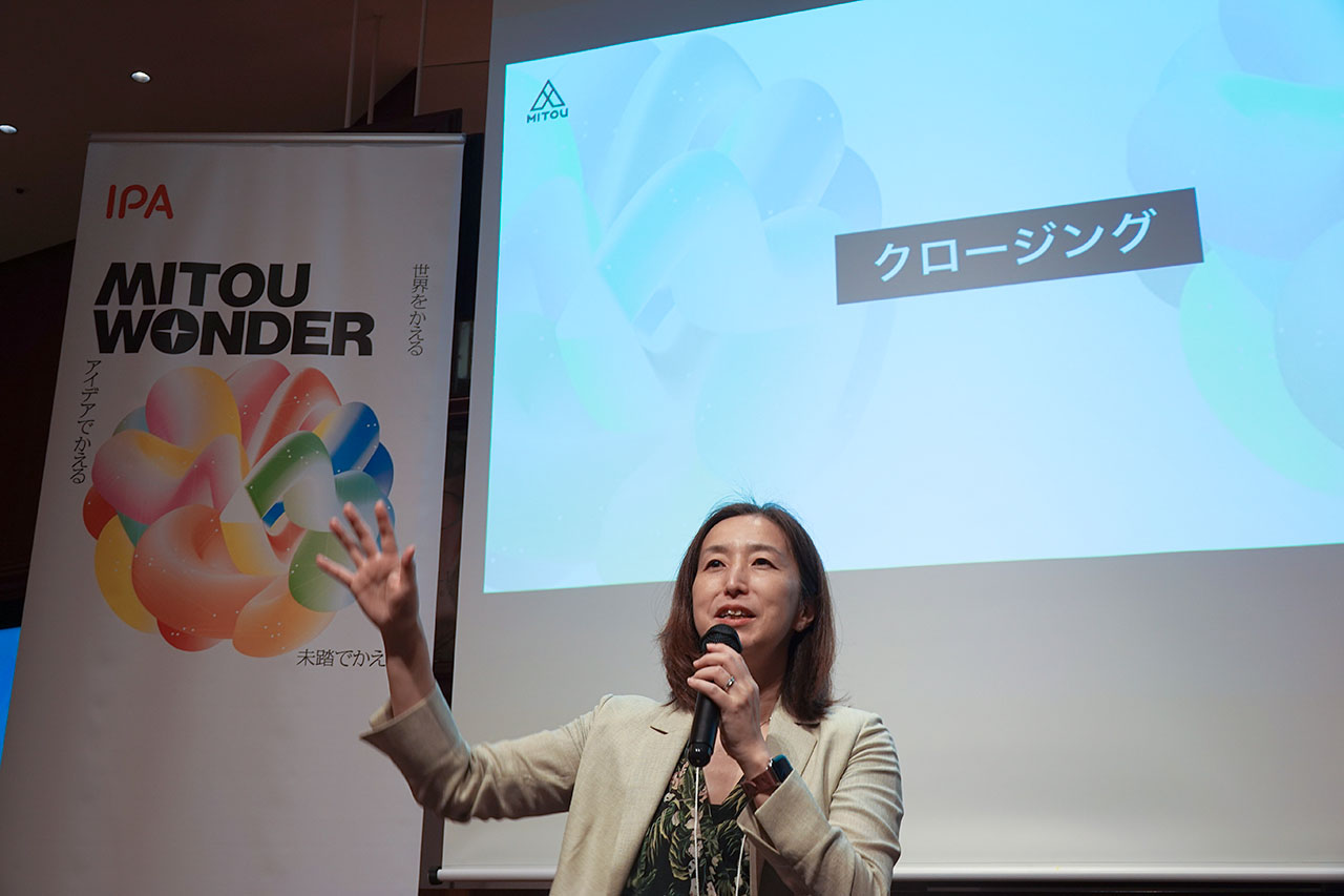 締めくくりの言葉は、未踏アドバンスト事業PM村上 明子さん(SOMPOホールディングス株式会社 執行役員常務 グループCDaO/損害保険ジャパン株式会社 執行役員CDaO/AIセーフティ・インスティテュート 所長)から。