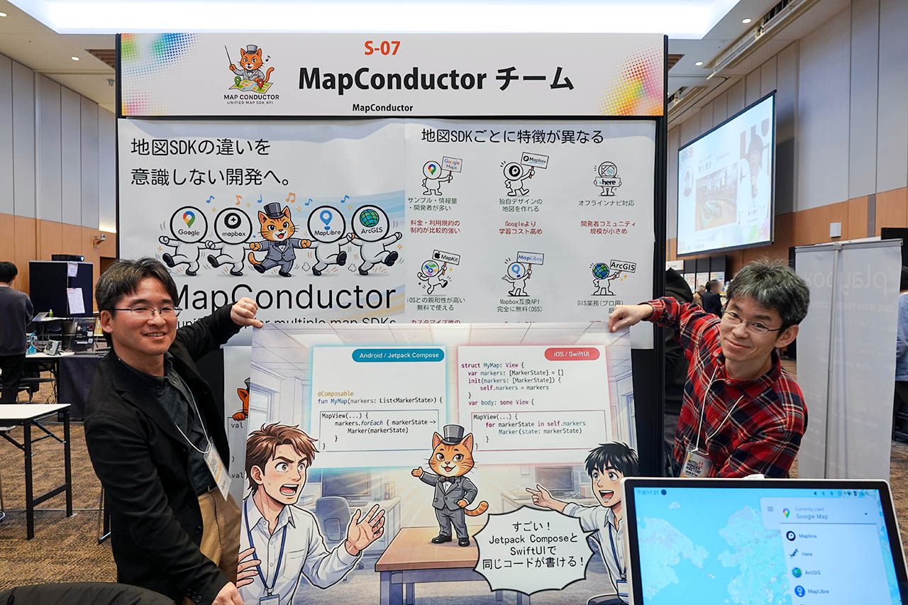 モバイル開発者のためのオープンソース統一地図SDK「MapConductor」で出展。「興味を持ってくれる方が多く、帰ったらやってみますという嬉しいお声がけもいただきました。出展した価値がありました!」