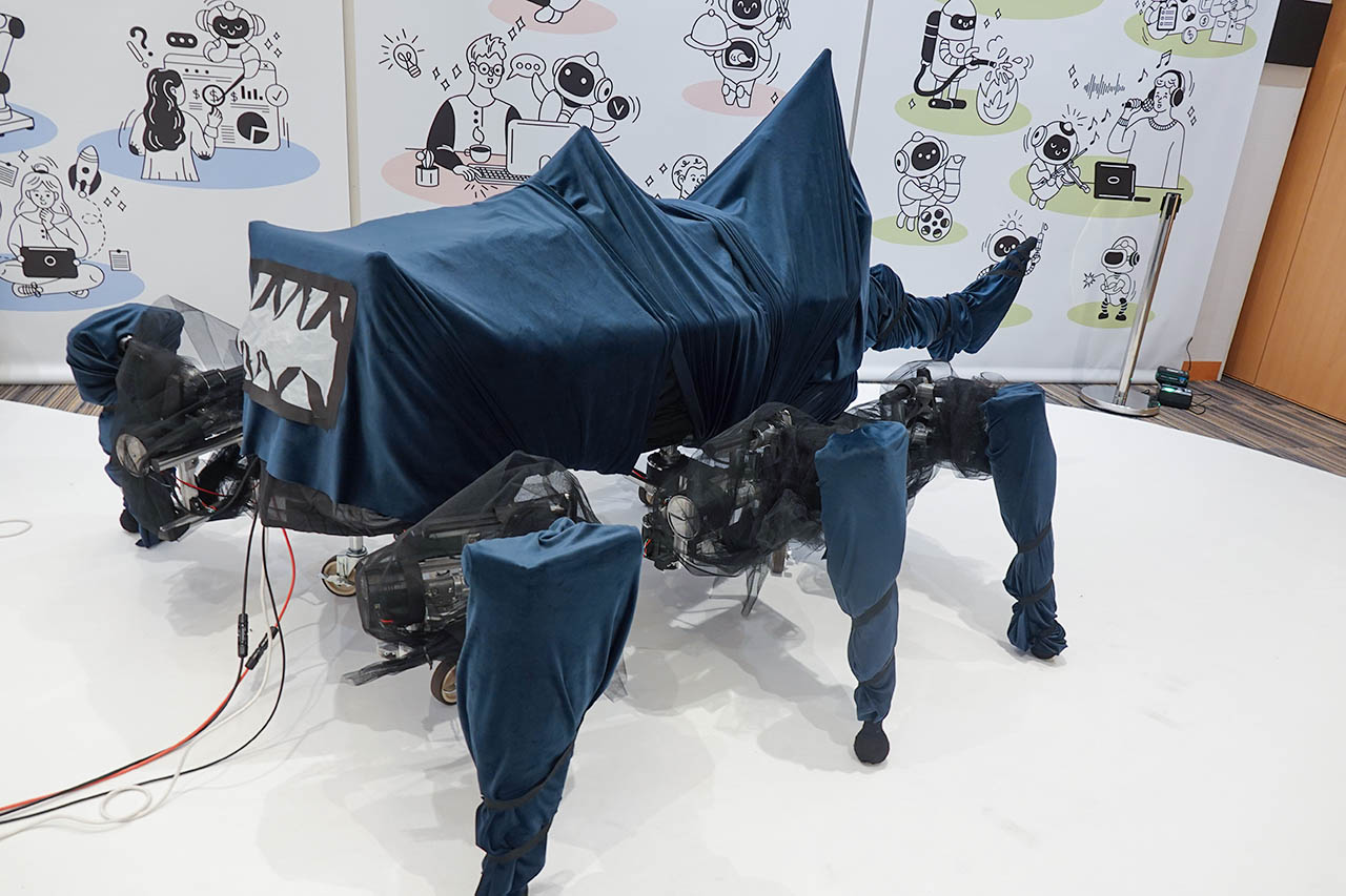 2025年度上期未踏アドバンスト事業修了生 大嶋 友香子さん・大嶋 悠司さんのプロダクト、大型6脚ロボット「ハルモニア・コンパス」。大阪・関西万博「未来のロボット展Geared by V-Sido」でも展示されました。外形はサメをイメージしており、砂浜など過酷な場所での歩行が可能だそうです。