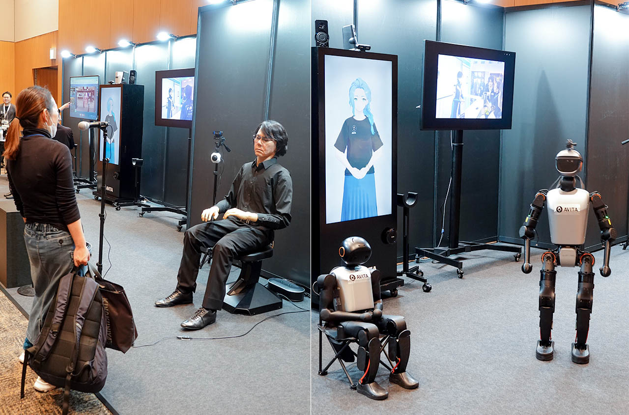 ひときわ来場者の注目を集めていたのが、石黒PMによる特別展示。代表作「ジェミノイドHI-6」は、見た目が石黒PMとそっくりなだけでなく、本人の思考や知識も備えていて、会話ができます。来場者はジェミノイドとの交流や対話を楽しんでいました(写真左)。ほかにも二足歩行ロボットやAIアバターの展示も行いました(写真右)。