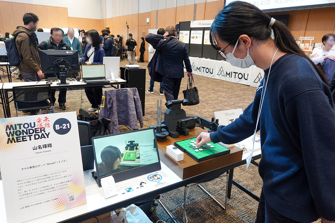 ただ強いだけではなく、人間にオセロを教えてくれるAIを搭載した、指導対局ロボット「Minoth(ミノス)」。オセロAIとオセロ解説システム、盤上を指示しコマを動かすロボットまですべて自作し、高級感あふれる木製筐体にひとつのシステムとして収めました。会場では大人から子供まで、多くの来場者が「Minoth」とオセロを楽しんでいました。
