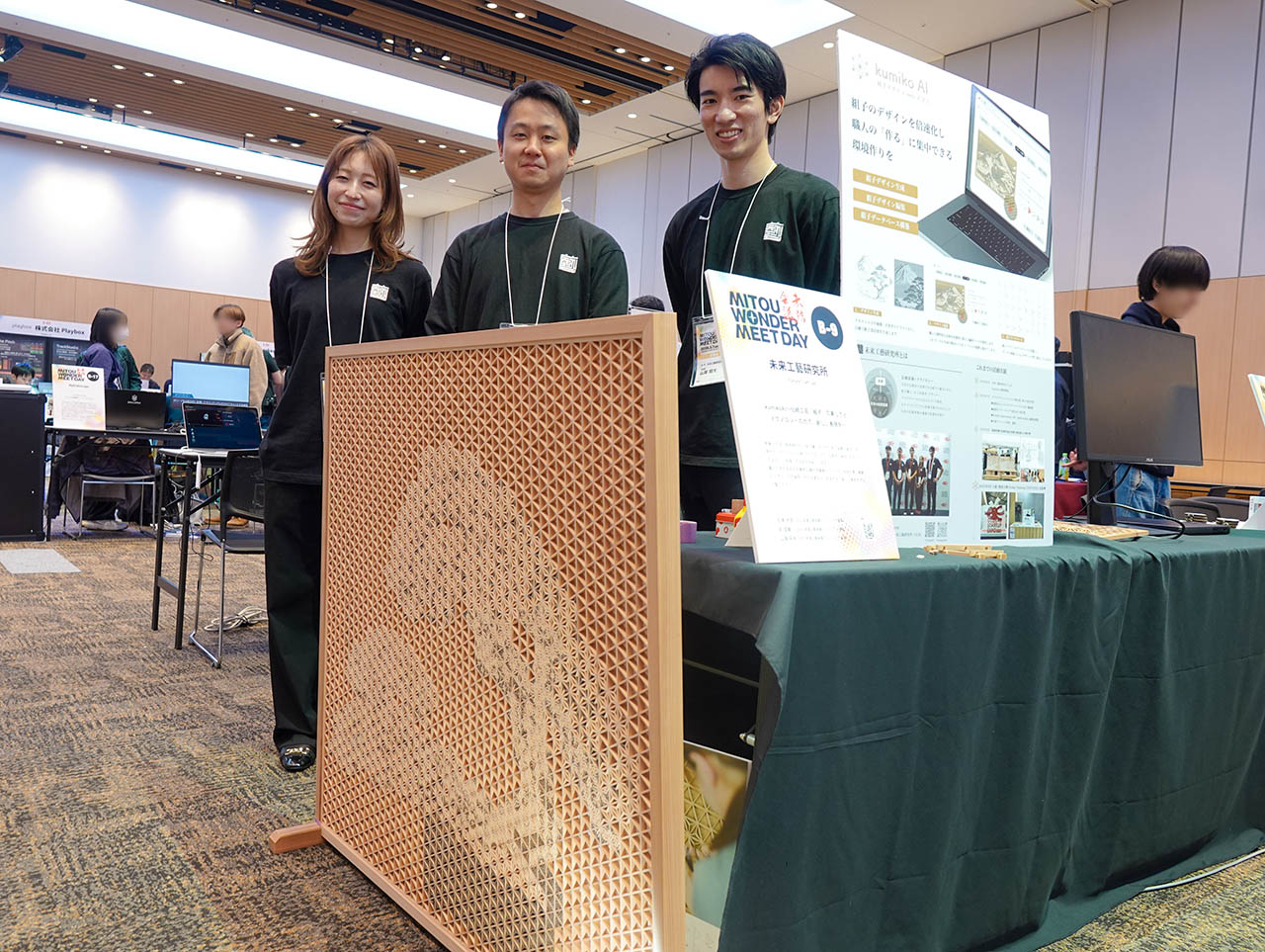 飛鳥時代から受け継がれてきた木工装飾「組子」を現代のテクノロジーと結びつけることで、伝統を"保存"するだけではなく、"拡張"するプロジェクト。この「kumiko AI」を用いるとテキスト入力や画像、手書きのイラストから自動で組子設計図を生成することができます。大阪・関西万博会場内で開催されたGSEでは、kumiko AIを用いて設計した、大阪・関西万博公式キャラクター・ミャクミャクを利用した組子作品を展示して話題に。未踏会議では、新作もお披露目されました。