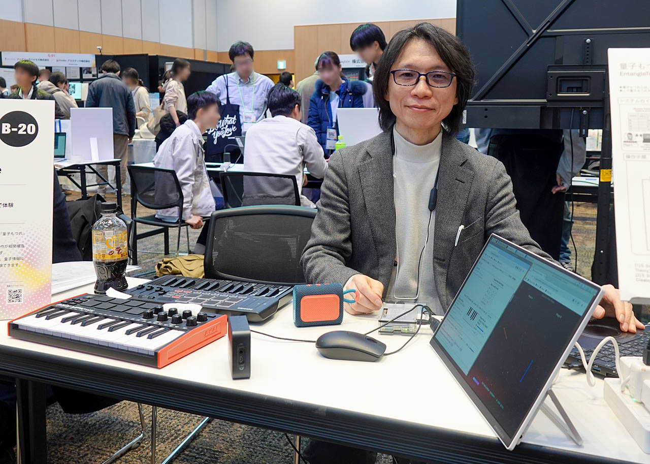 相馬さんは、量子コンピューティングを支える重要な概念である「量子もつれ」を応用した、2人参加型の即興演奏システムを開発しました。2人の操作が相関構造を持って反映され、音の振る舞いが動的に決定されるそうです。来場者も鍵盤に触れて、量子が奏でる音の世界を体感していました。