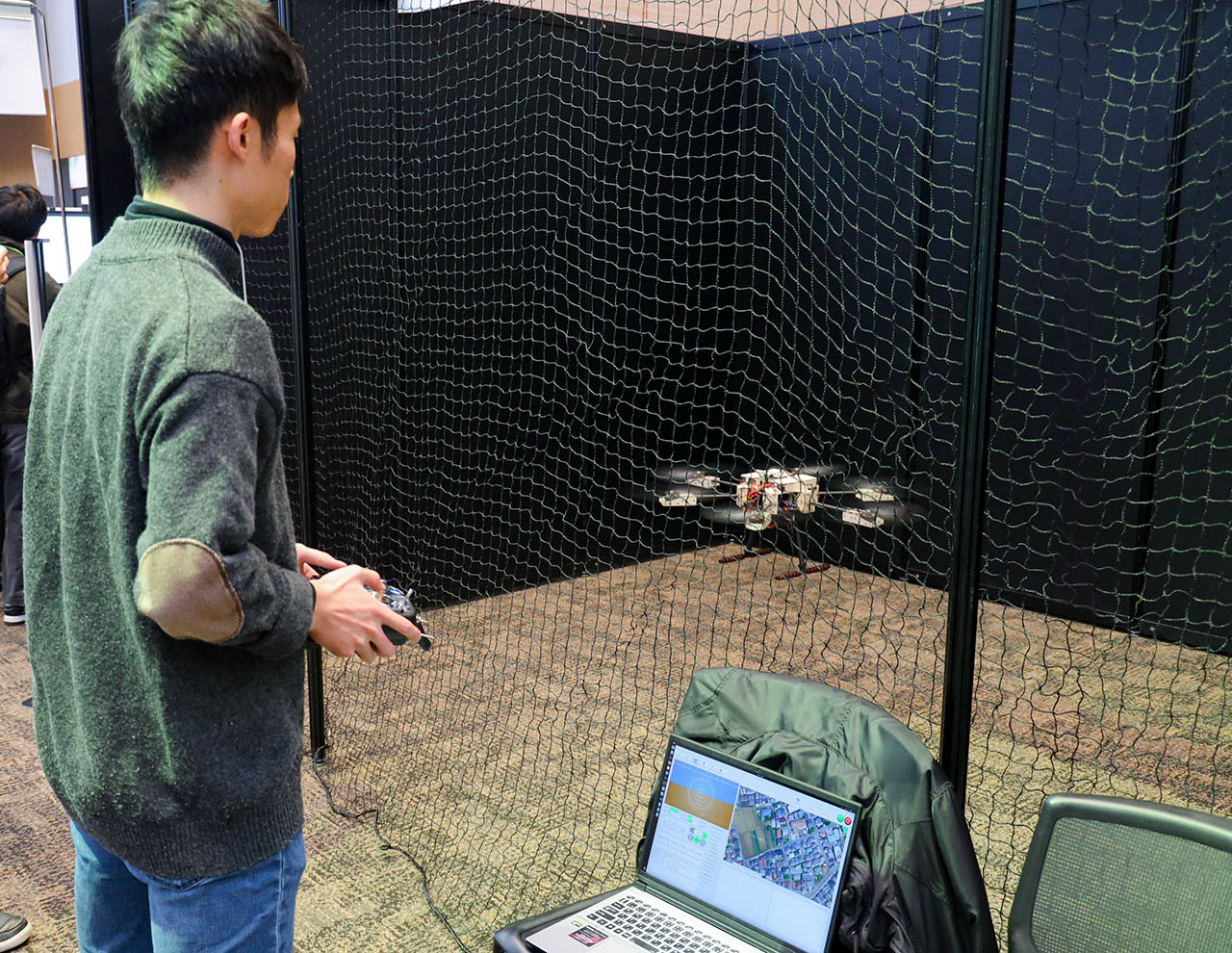 モデルベースの新しいフライトコントローラー、「Tobas」。ロボット記述言語で定義した正確な機体構造を制御系に反映させるため、従来のフライトコントローラーでは操作が難しい複雑な機体でも精度良く飛ばすことができるそうです。会場では、ドローン専用の飛行エリアが設けられ、このコントローラーによるドローンの飛行デモが実施されました。