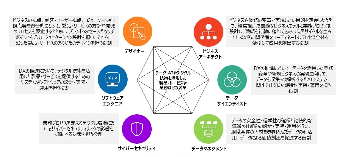 DXの推進において、データを活用した業務変革や新規ビジネスの実現に向けて、データを収集・の解析するやAIシステムに関する仕組みの設計・実装・運用を担う役割