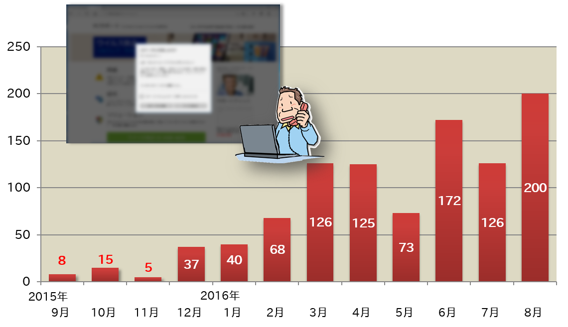 IPAでは2015年8月の呼びかけ(脚注1)で“あなたのコンピュータでウイルスが検出されました”という音声が突然パソコンから流れ、ウイルスを削除するためにサポートの連絡先に電話をかけるよう仕向ける、通称“偽警告”の手口について取り上げました。これに関する相談は昨年末から今年に入り増加の兆しを見せ、3月以降急増(図1)しています。