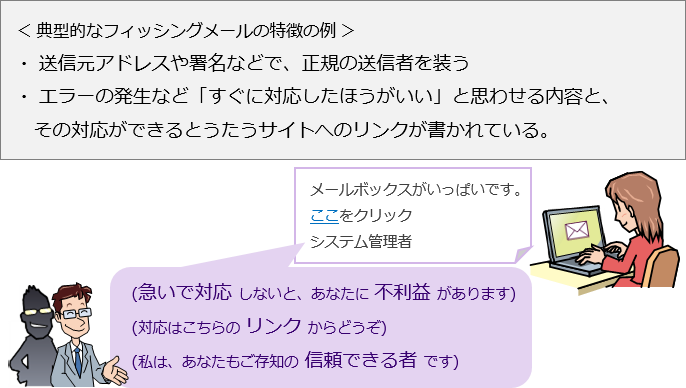 大学で利用しているウェブメールサービスのシステム管理者を装い、送信エラーやメールボックスがいっぱいであるなどと記載されたメールが、大学の学生や教職員あてに送られてきます。