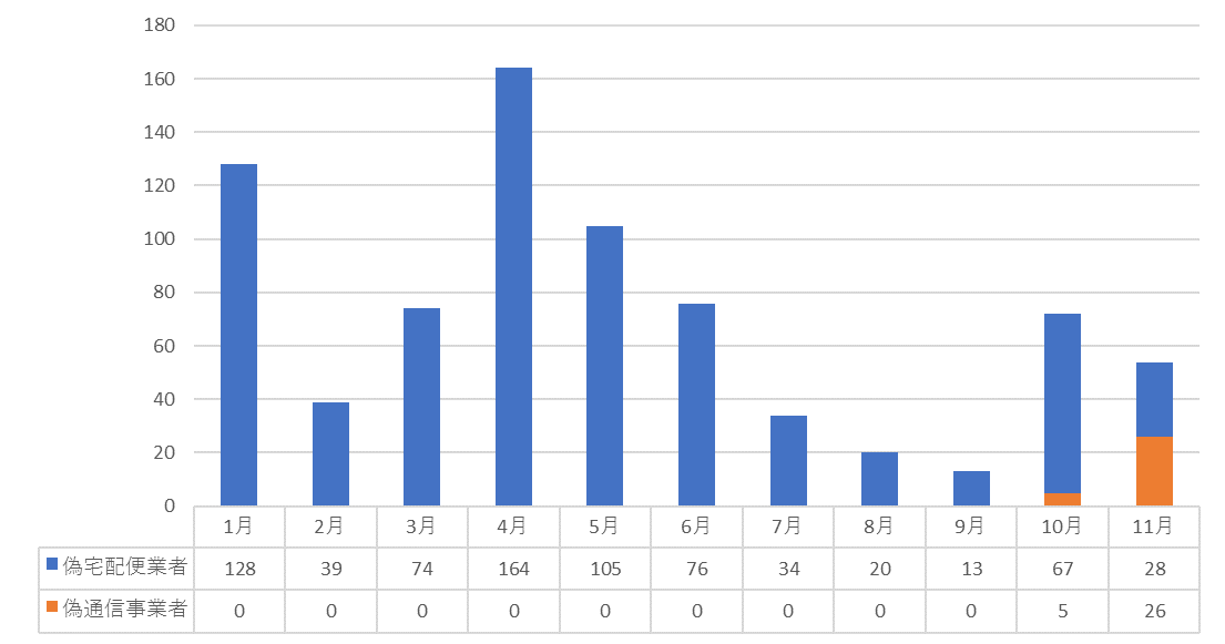 通信事業者をかたる偽SMSは10月頃から相談を受けるようになりました(図2)。偽SMSの手口は、これまでにもかたるブランド名を変えてきた経緯(脚注2)もあり、今後も利用者が多いブランド名をかたり継続すると考えられます。