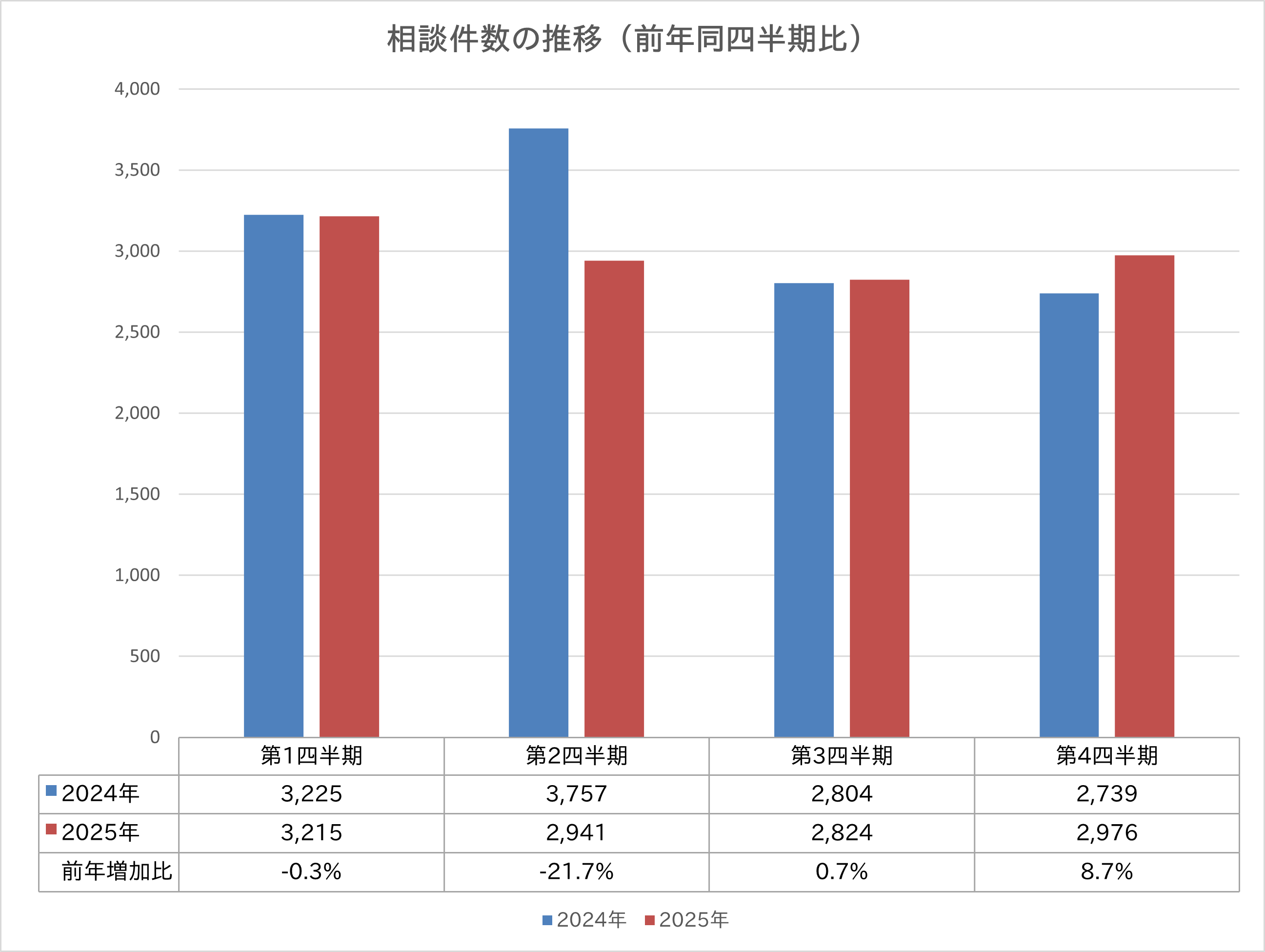 今四半期の相談対応件数は、前年同四半期比では約8.7%増となっており、ほぼ変わらない相談件数となっています。
