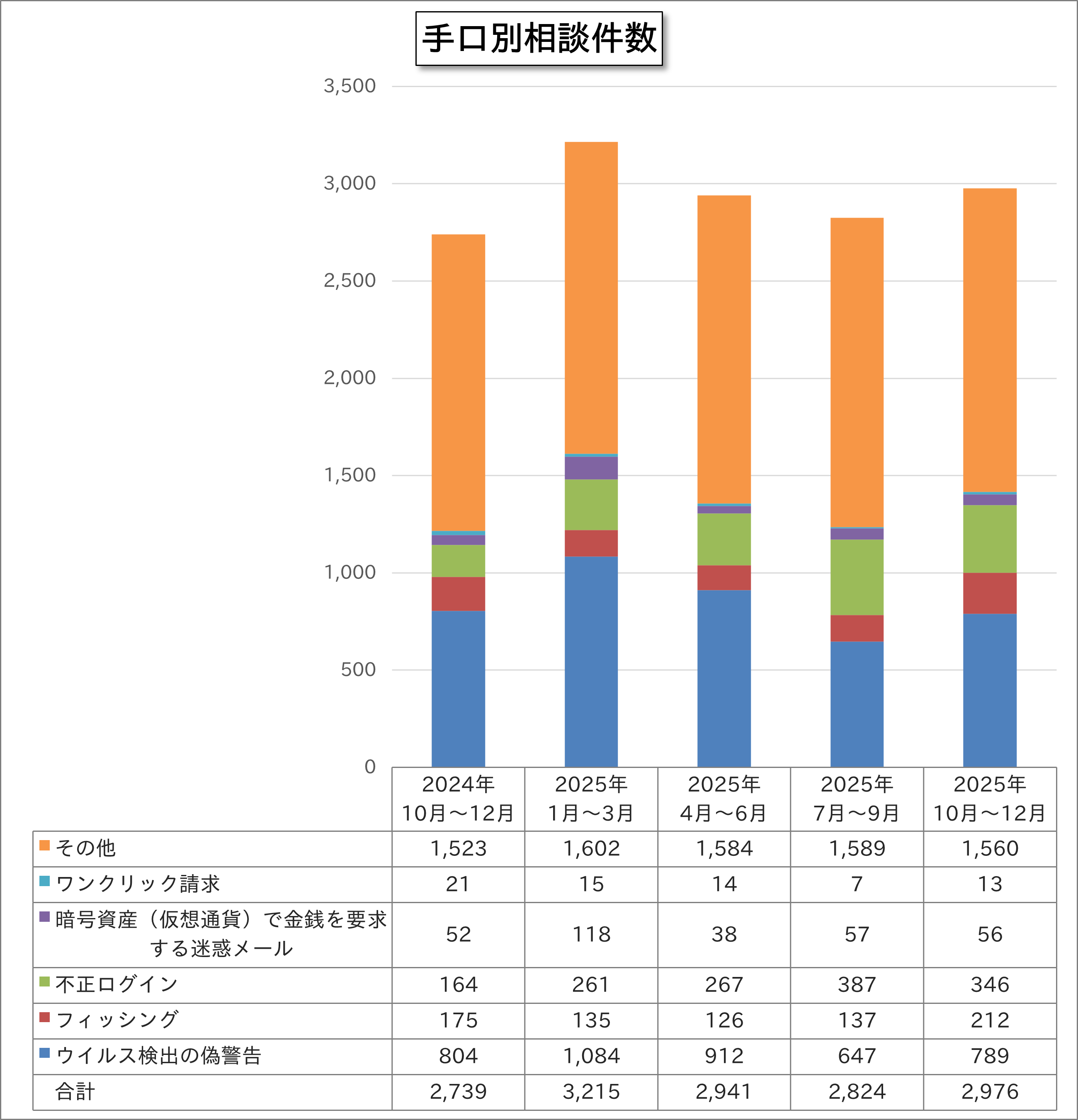 今四半期の主な手口別相談件数は、相談件数の多い手口の順に「ウイルス検出の偽警告」789件(構成比26.5%)が最も多く、続いて「不正ログイン」346件(同11.6%)、「フィッシング」212件(同7.1%)、「暗号資産(仮想通貨)で金銭を要求する迷惑メール」56件(同1.9%)、「ワンクリック請求」13件(同0.4%)、でした。