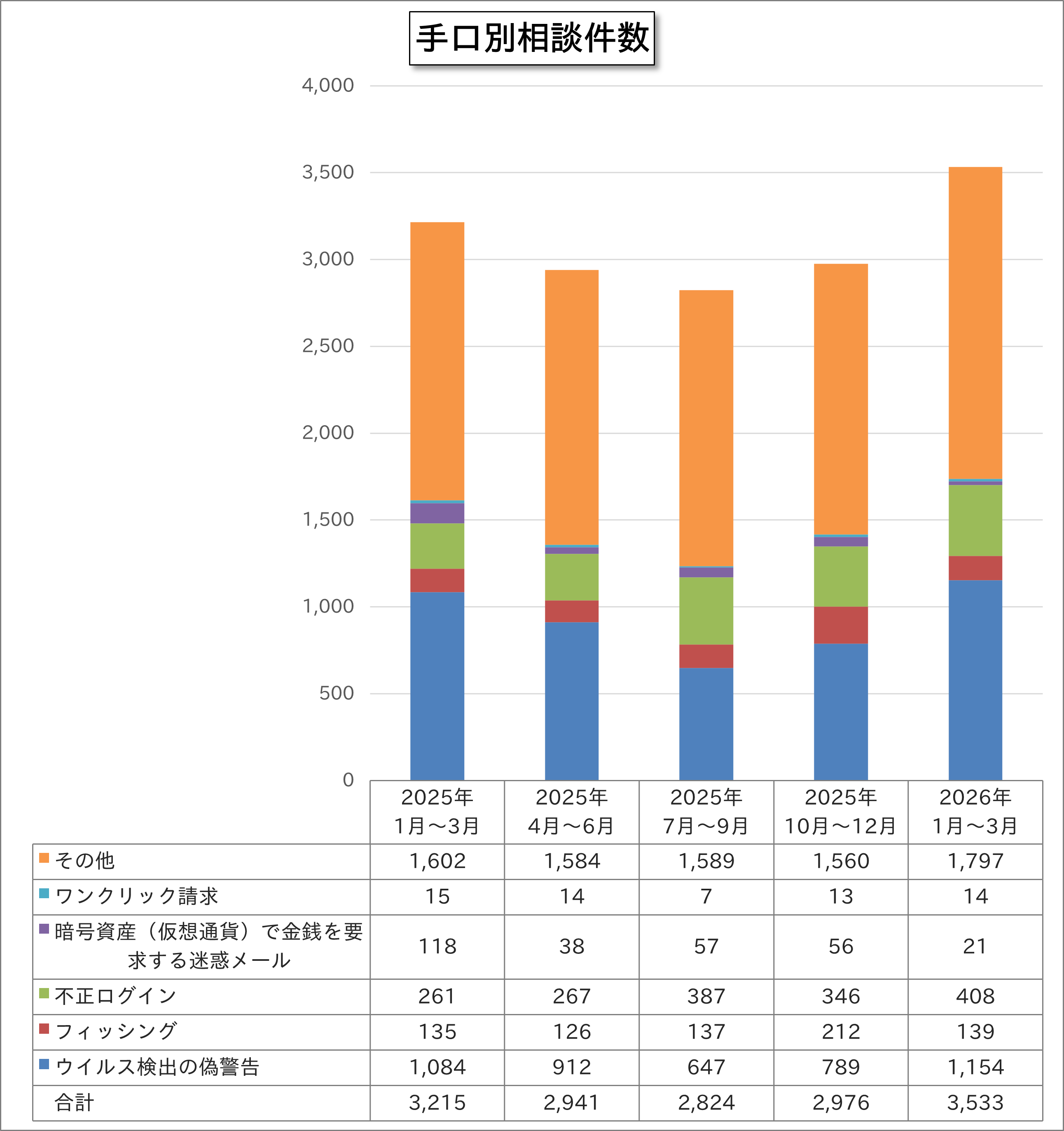 今四半期の主な手口別相談件数は、相談件数の多い手口の順に「ウイルス検出の偽警告」1,154件(構成比32.7%)が最も多く、続いて「不正ログイン」408件(同11.5%)、「フィッシング」139件(同3.9%)、「暗号資産(仮想通貨)で金銭を要求する迷惑メール」21件(同0.6%)、「ワンクリック請求」14件(同0.4%)、でした。