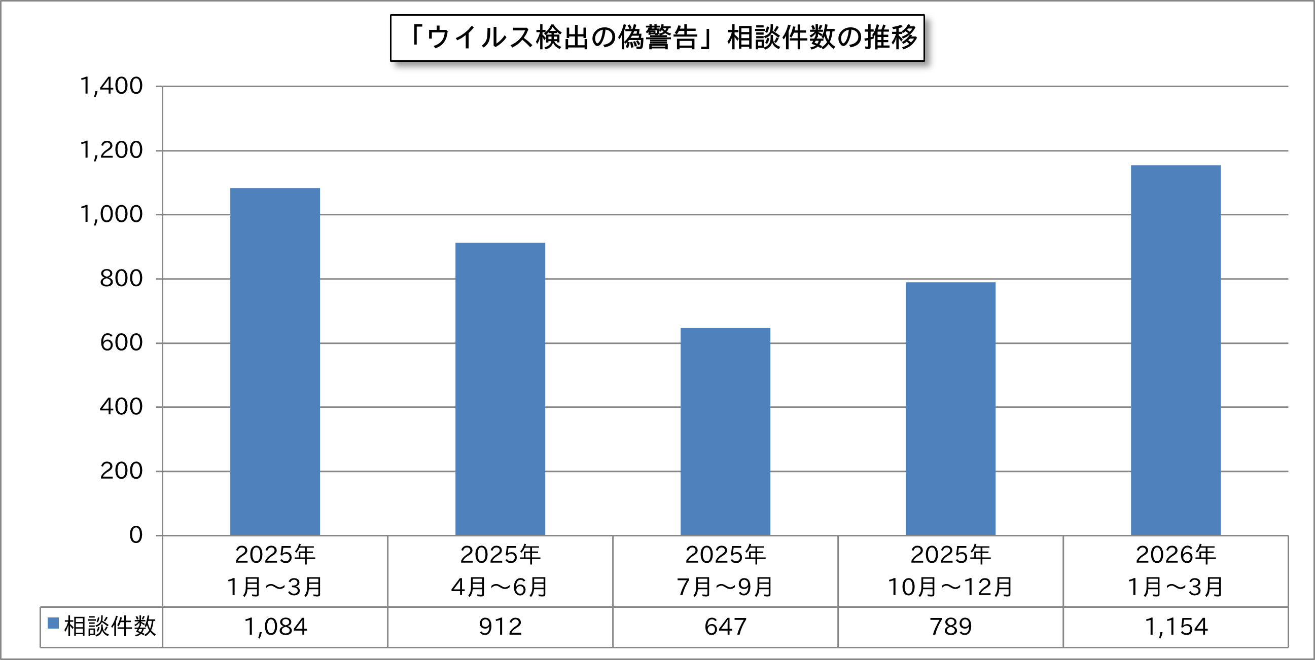 ウイルスを検出したという偽警告で不安を煽り、電話をかけさせてサポート契約に誘導する「ウイルス検出の偽警告(脚注1)」に関する相談は前四半期から約46.3%増の1,154件寄せられました。