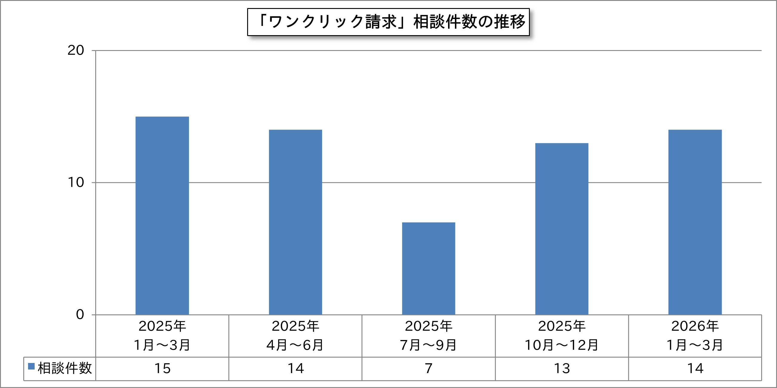 今四半期は「ワンクリック請求(脚注4)」に関する相談が前四半期から7.7%増の14件寄せられました。ワンクリック詐欺の手口内容に変化はみられません。アダルトサイトを観ていたところ、突然会員登録が完了し、金銭を支払うように指示する画面がでてきたことに関して、支払の必要性についての相談が寄せられています。