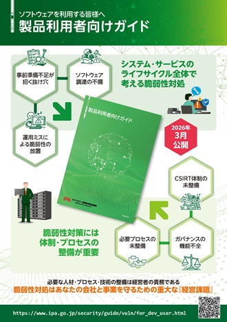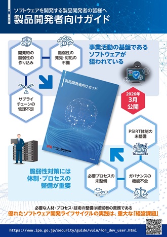 そこで今回、ソフトウェアの脆弱性に起因するサイバー攻撃の被害を最小限に抑えられるよう、ソフトウェアを開発する「製品開発者」と、ソフトウェアを利用する「製品利用者」を対象としたガイドを作成・公開しました。