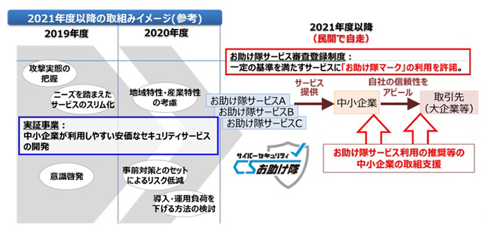 実証事業の過程で中小企業のニーズにマッチした民間サービスの開発が進められる中で、IPAでは、本実証事業の結果等を踏まえ、相談窓口、異常の監視、緊急時の対応支援、簡易サイバー保険などの各種サービスをワンパッケージで安価に提供することを要件としてまとめた「サイバーセキュリティお助け隊サービス基準」を2021年2月に策定・公表しました。