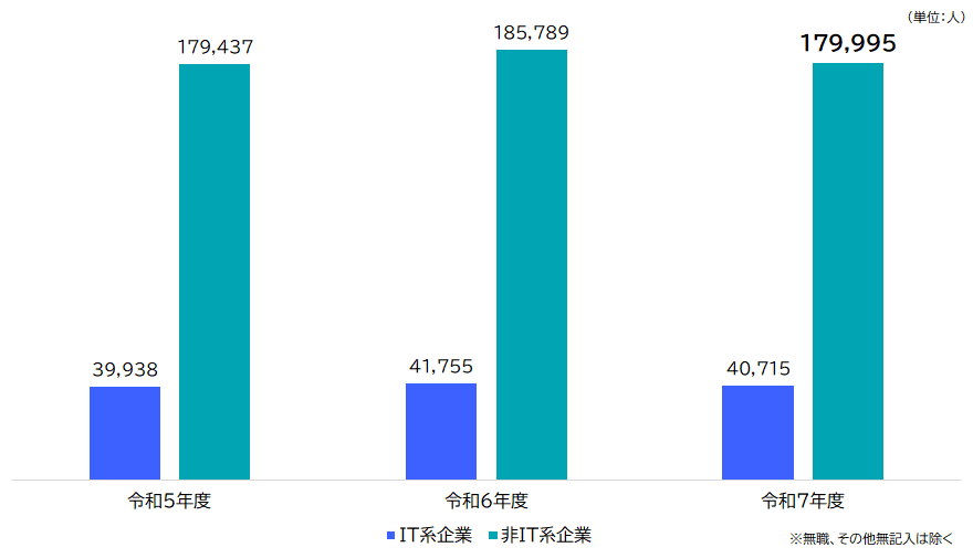 令和7年度の社会人応募者数を勤務先別にみると、非IT系企業の応募者数(179,995人)がIT系企業(40,715人)の応募者数を大きく上回りました(図3)。引き続き、非IT系企業を中心に活用されていることが分かります。