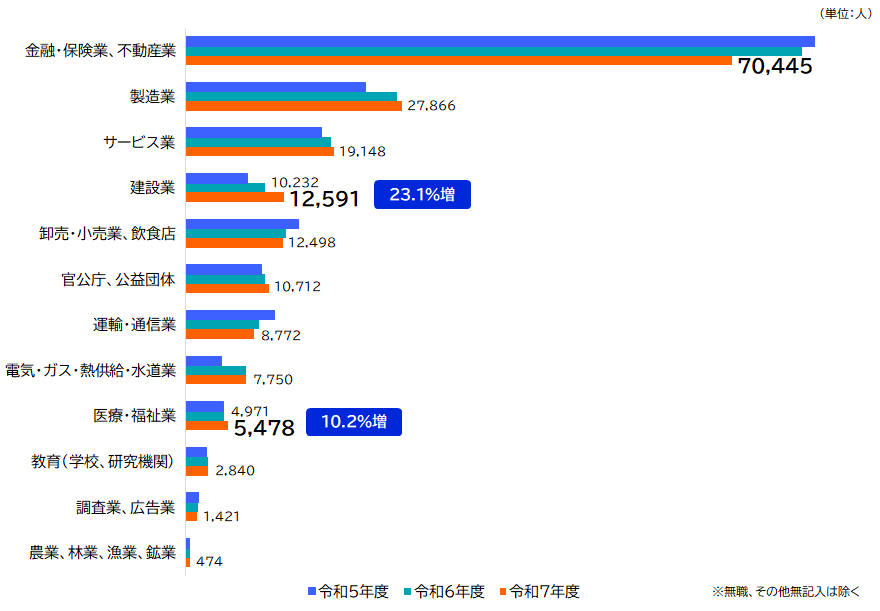 非IT系企業の内訳をみると、「金融・保険業、不動産業」が令和7年度も70,445人と最も多い結果となりました。また、前年度と比べると、特に「建設業」(23.1%増)と「医療・福祉業」(10.2%増)で応募者数が大きく増加しました(図4)。