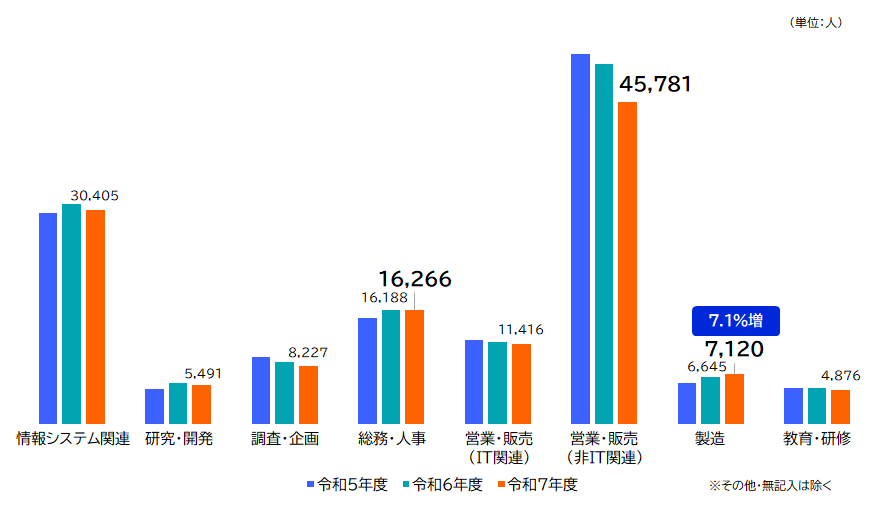 令和7年度の社会人応募者数を業務別にみると、「営業・販売(非IT関連)」が45,781人と最も多い結果となりました。また、前年度と比べると、「製造」は7,120人で7.1%増と最も高い増加率となりました(図5)。