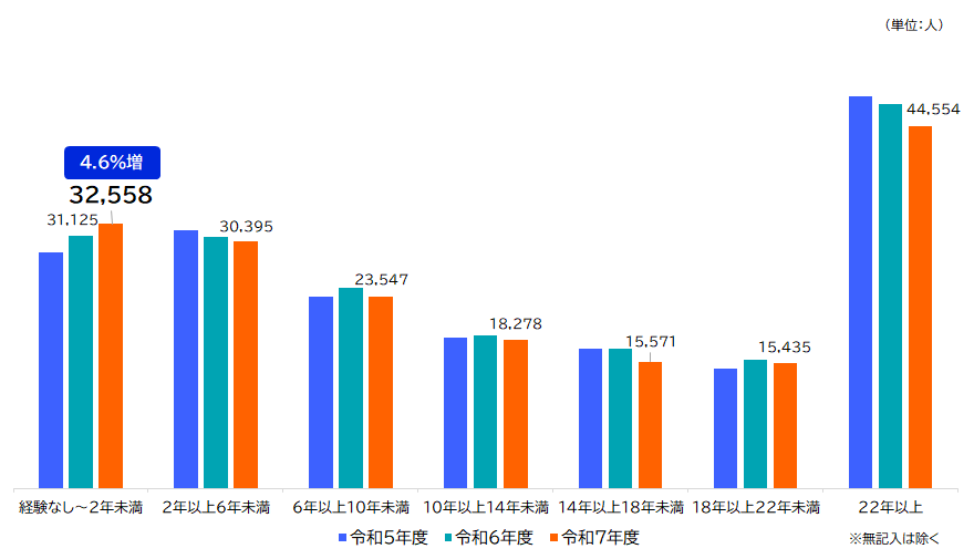 令和7年度の社会人応募者数を勤務経験年数別にみると、「経験なし~2年未満」で前年度から応募者数が増加し、32,558人(4.6%増)となりました(図6)。