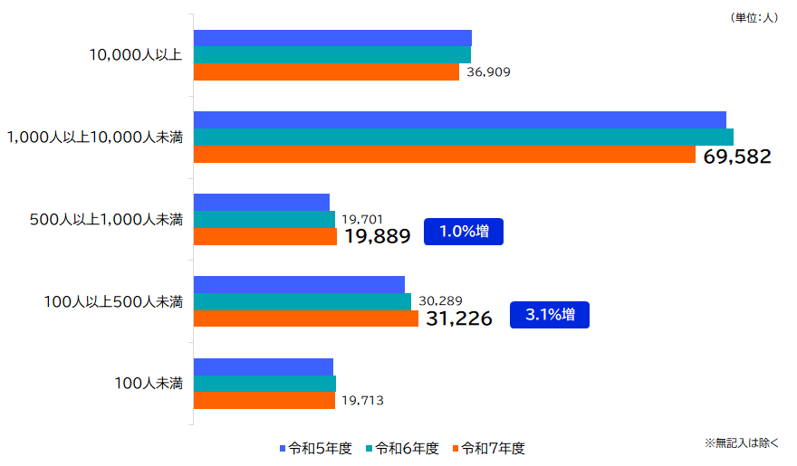 令和7年度の社会人応募者数を勤務先企業の従業員数別にみると、令和7年度は「1,000人以上10,000人未満」が69,582人と最も多く、次いで「10,000人以上」が36,909人、「100人以上500人未満」が31,226人となりました。また、前年度と比べると、「100人以上500人未満」は3.1%増、「500人以上1,000人未満」は1.0%増となりました(図7)。