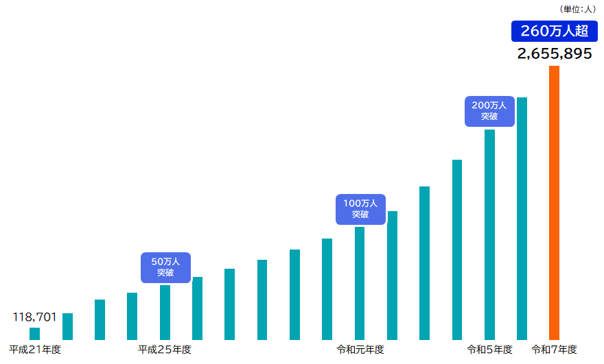 また、平成21年度の試験開始以来の累計応募者数は、令和8年3月末時点で2,655,895人となり、260万人を突破しました(図2)。