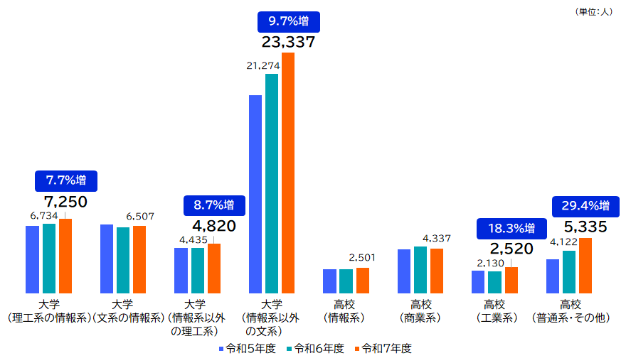 令和7年度の学生・生徒の応募者数を在学中の学校別にみると、大学では「情報系以外の文系」が23,337人と最も多く、前年度と比べると9.7%増となりました。また、「理工系の情報系」は7,250人で7.7%増、「情報系以外の理工系」は4,820人で8.7%増となりました。